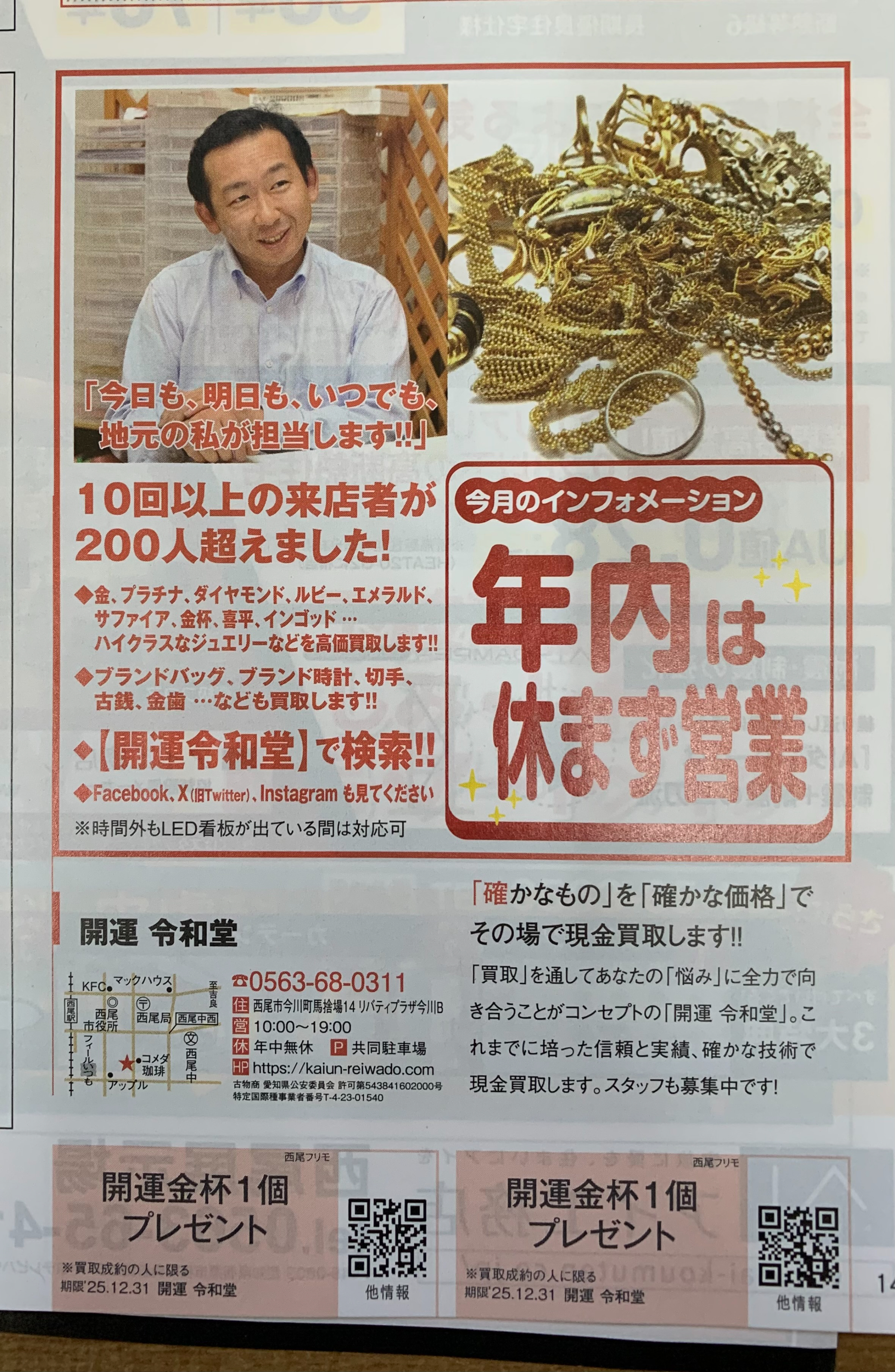 2025/11/24 NEW 西尾フリモ12月号 掲載のお知らせ お知らせ 日頃より開運令和堂をご利用いただき、ありがとうございます。 このたび、地域みっちゃく生活情報誌 「西尾フリモ 12月号」 に当店が掲載されました!地域の方に当店を知っていただくきっかけとなり、大変うれしく思います。 ぜひこの機会に、当店オンラインショップもご覧ください。