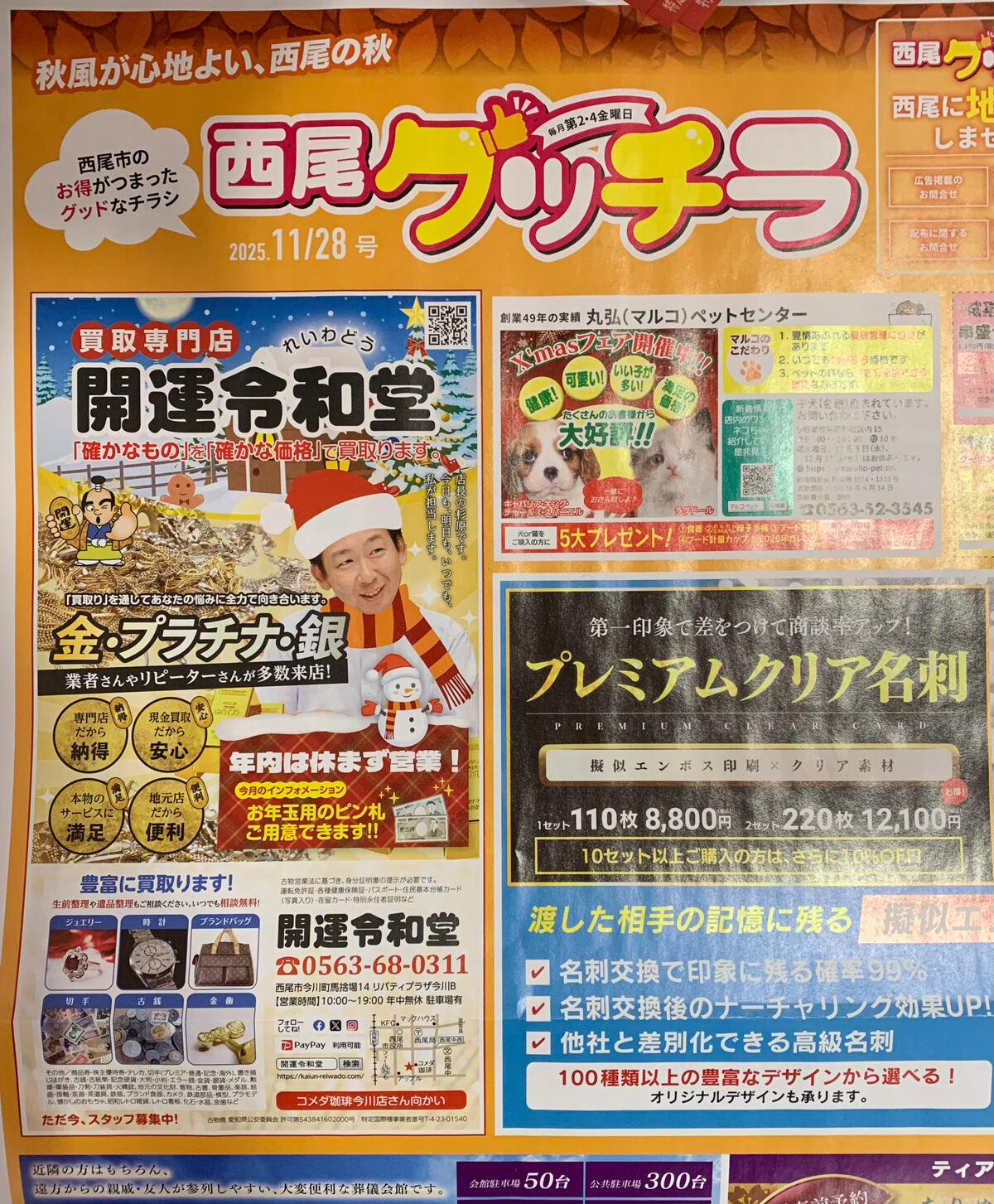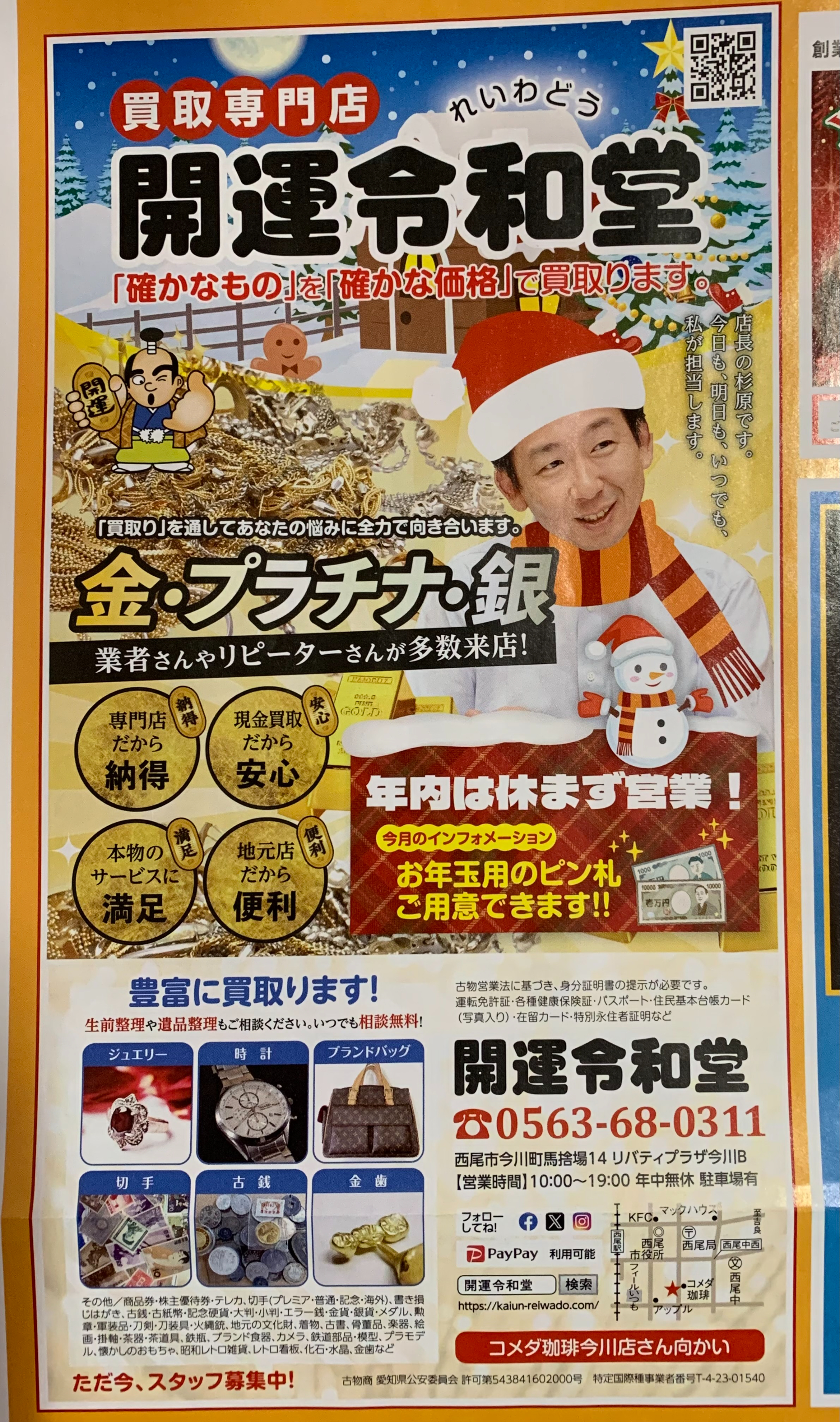 2025/11/28 NEW 西尾グッチラ(2025年11月28日号)に掲載されました! お知らせ いつも開運令和堂をご利用いただき、ありがとうございます。 このたび、地域密着情報誌 「西尾グッチラ」 に当店が掲載されました。買取専門店として、 金・プラチナ・銀・ブランド品・記念硬貨・切手・テレカなど 幅広いお品を 確かな査定、確かな価格 で買取しております。また、オンラインショップでは レターパック各種をはじめ、コレクター向けアイテムも多数販売中! これからも地域の皆さまに信頼いただけるお店づくりを目指してまいります。 ぜひオンラインショップもご覧ください。