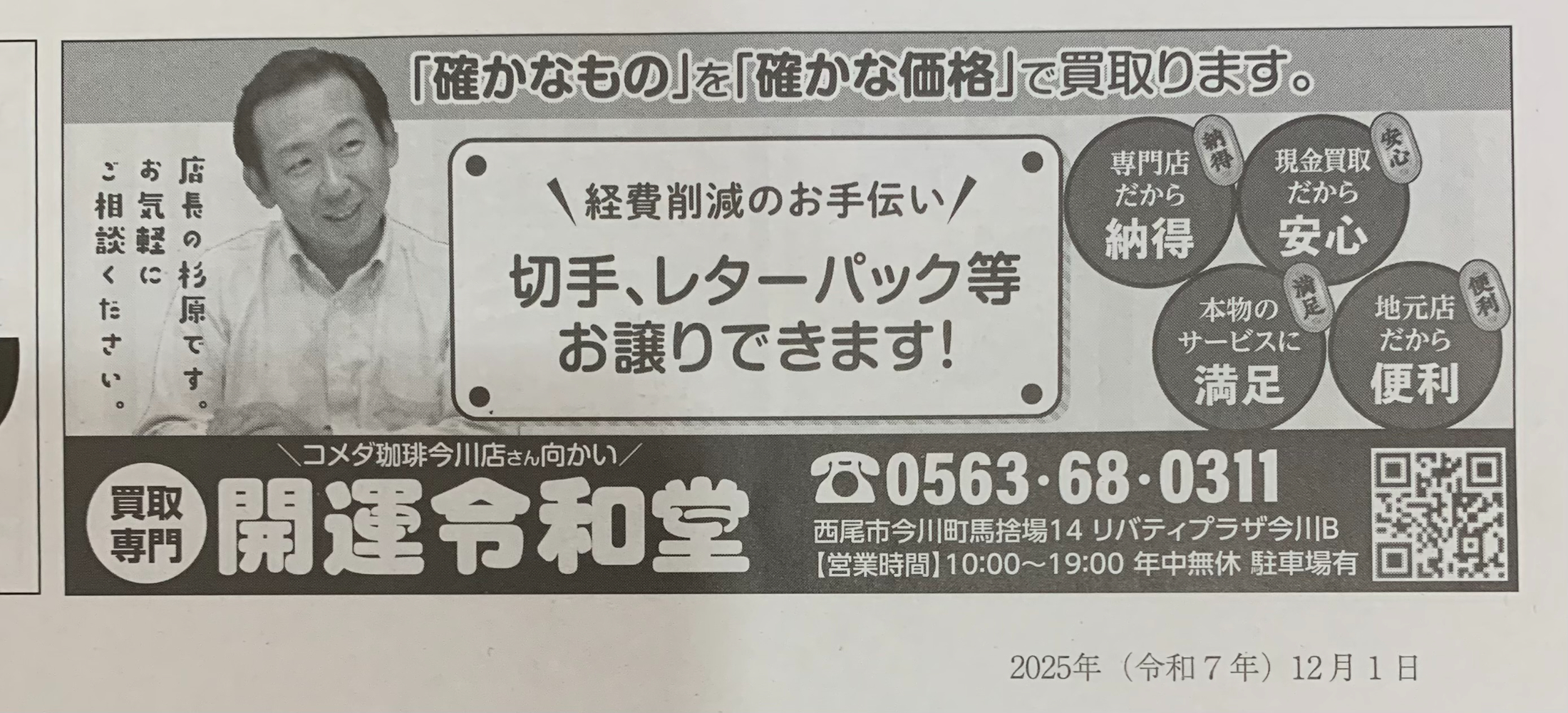2025/12/12 NEW 商工会議所情報「にしお」12月号に掲載されました! お知らせ このたび、 西尾商工会議所発行「商工会議所情報 にしお」12月号に **買取専門店「開運令和堂」**が掲載されました。当店では・切手・レターパック・商品券・CD・レコード・ホビー・コレクター品 など、幅広いジャンルを 確かな査定・安心価格 で買取しております。地域密着・専門店ならではの対応で、 初めての方も安心してご相談いただけます。また、買取だけでなく掘り出し物が見つかる オンラインショップ も好評営業中です。 ぜひこの機会に、 開運令和堂オンラインショップをご覧ください。