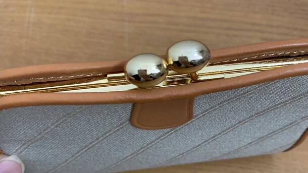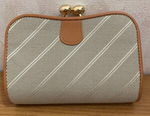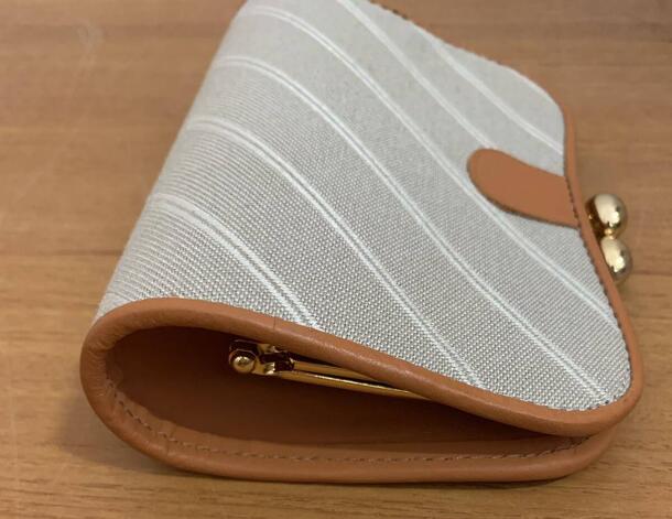 クラシックながま口タイプで、手のひらサイズのコンパクトな形状が特徴。柔らかなブラウンとグレーの組み合わせに、斜めストライプの織り柄がアクセントとなり、シンプルながらも高級感を演出しています。