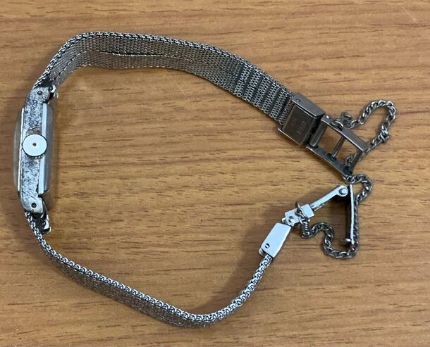 縦長のレクタンギュラーケースに、シルバーカラーの装飾風ラグ&ブレス一体型デザイン。