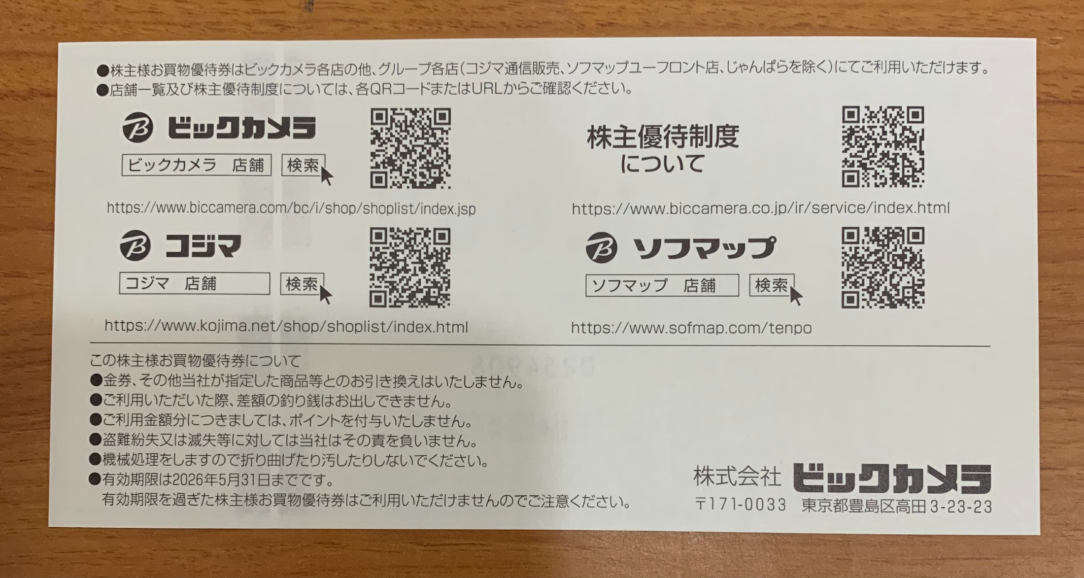 ビックカメラ の店舗および公式通販で利用できる、便利な株主優待券です。