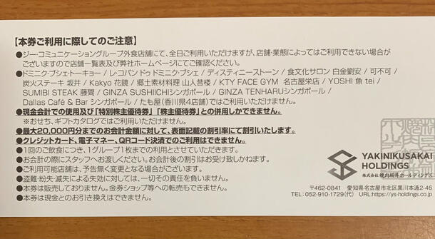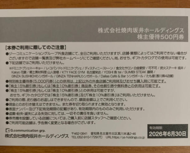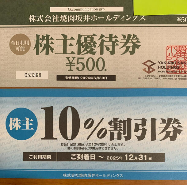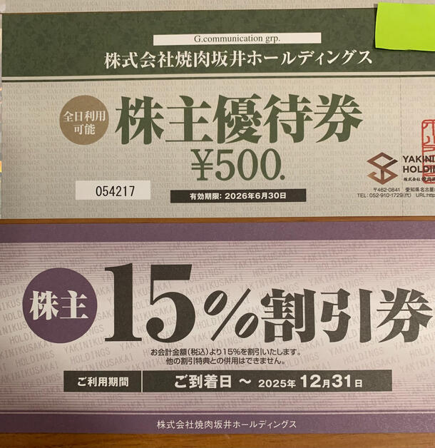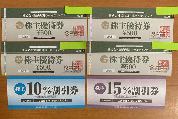 株式会社焼肉坂井ホールディングス 株主優待券 500円×4枚、15%割引×1枚、10%割引×1枚