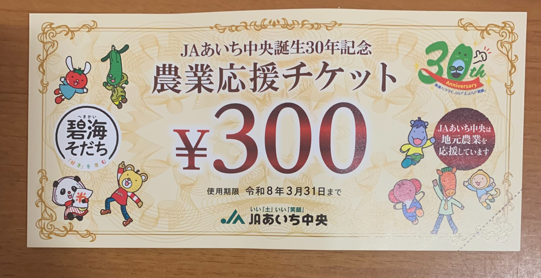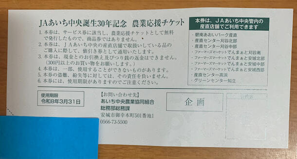 JAあいち中央誕生30周年を記念して発行された農業応援チケットです。