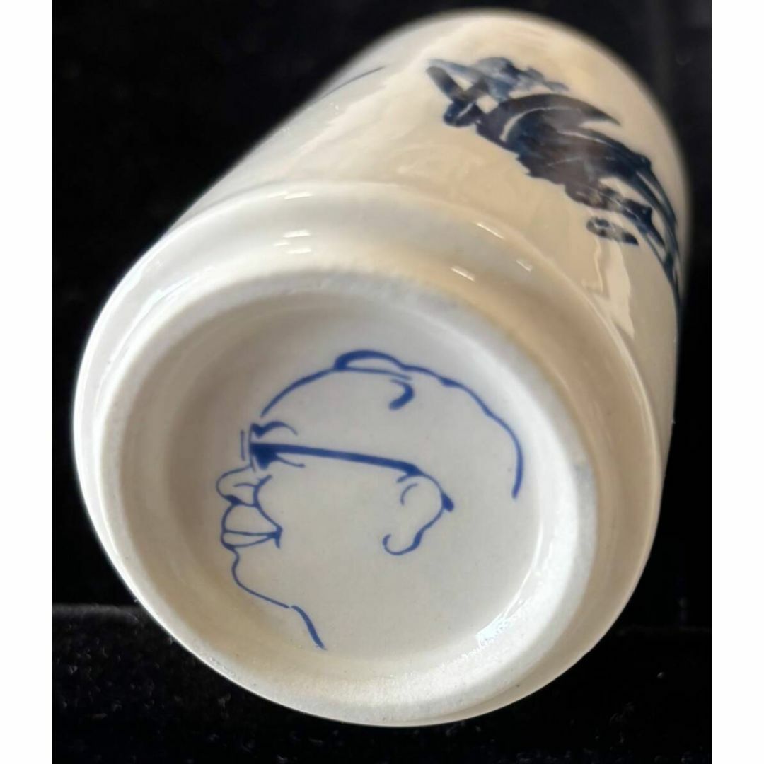 白磁に藍色の草花文様が描かれたシンプルで落ち着いたデザインで、記念品や贈答品として作られたものと思われます。