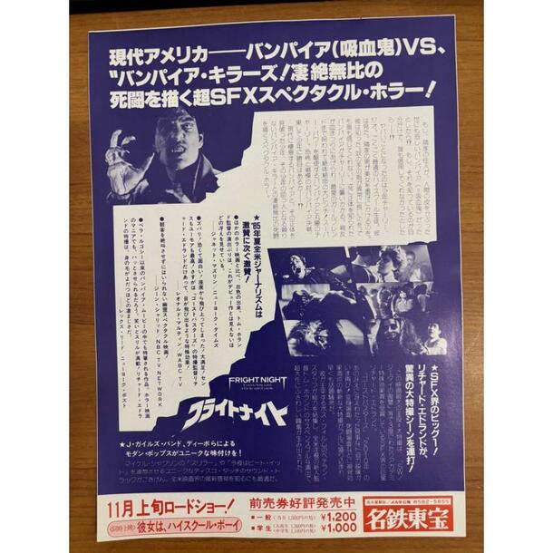 1985年公開のホラー映画『フライトナイト(Fright Night)』の劇場配布用フライヤー(チラシ)です。