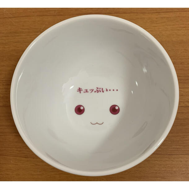 器の底にはキュゥべえの顔と「キュッぷい…」のセリフ入りで、見て楽しめる遊び心のあるアイテムです。