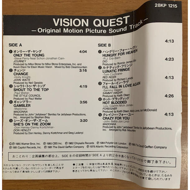 映画 「Vision Quest(ビジョン・クエスト / 青春の賭け)」 のオリジナル・サウンドトラックカセットテープです。