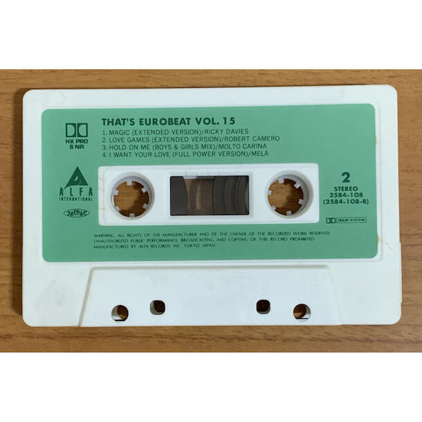 カセットテープ「That’s EUROBEAT ユーロビート Vol.15」は、80〜90年代に人気を博したユーロビート楽曲を収録したシリーズの1本です。