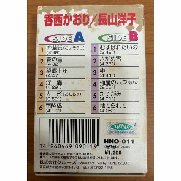 演歌・歌謡曲で人気の 香西かおり と 長山洋子 の楽曲を収録したカセットテープです。
