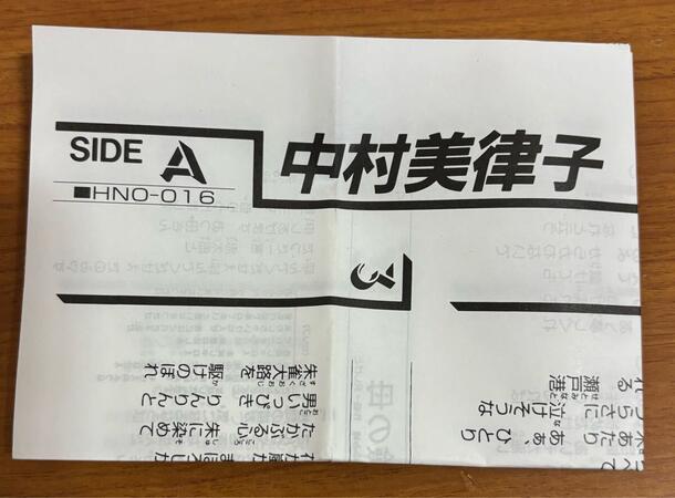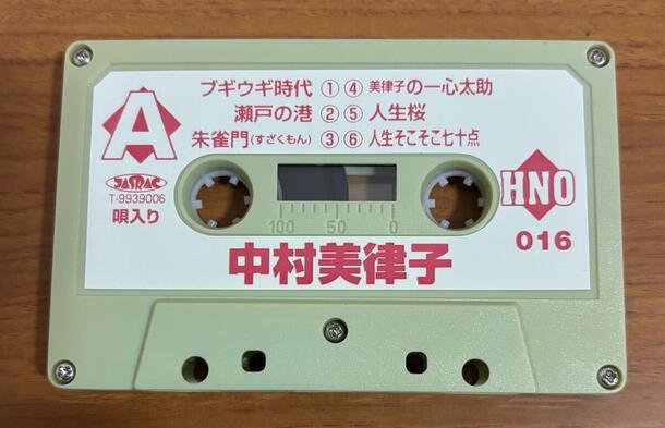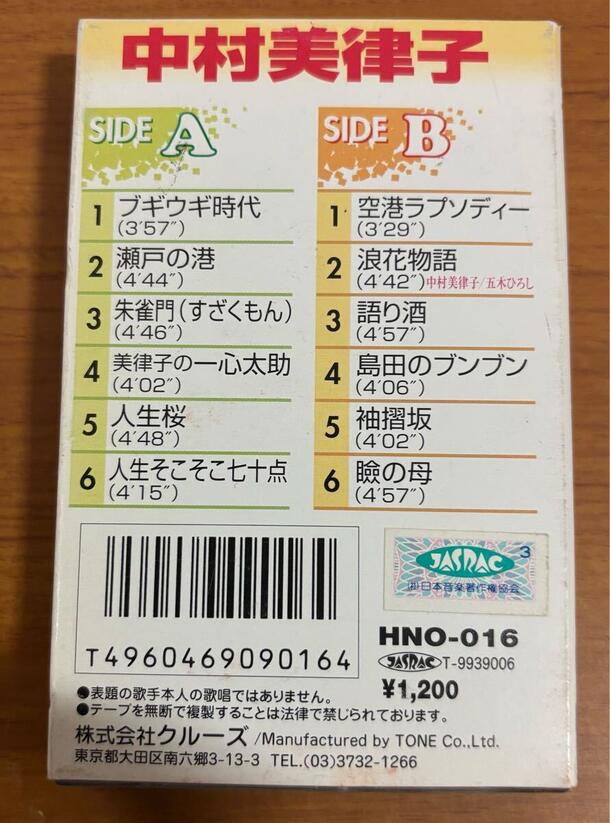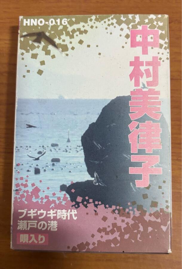 演歌歌手・中村美律子によるヒット曲「ブギウギ時代」「瀬戸の港」を収録したカセットテープです。