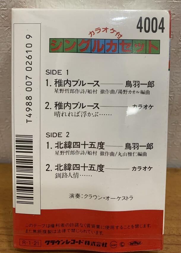 演歌界の人気歌手・鳥羽一郎によるシングル「稚内ブルース/北緯四十五度」を収録したカラオケ付きシングルカセットです。