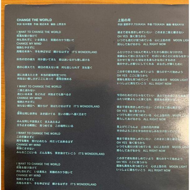 V6が歌う大人気アニメ『犬夜叉』のオープニングテーマとして知られる名曲「CHANGE THE WORLD」を収録したシングルCD。