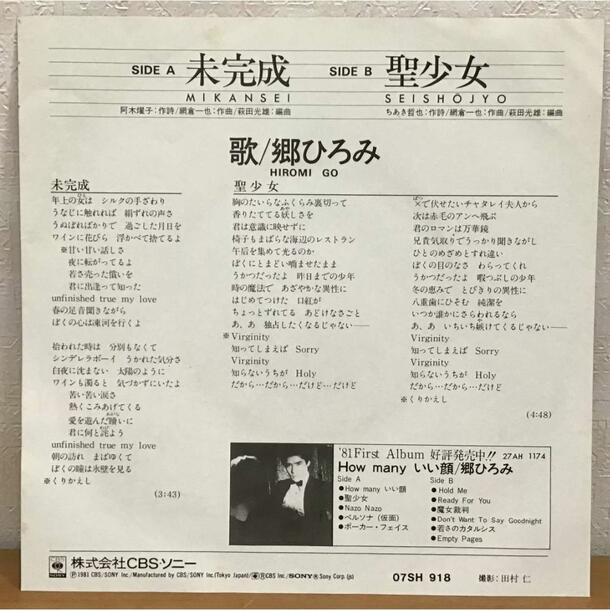 表題曲「未完成」は、切なさと大人の雰囲気を持つミディアムテンポの名曲で、郷ひろみの表現力豊かな歌声が存分に味わえます。