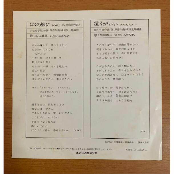 「ぼくの妹に」/「泣くがいい」 を収録したEPレコードです。