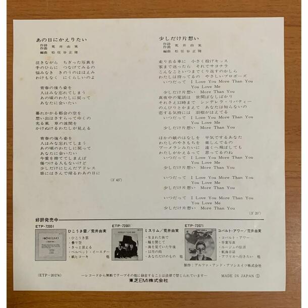 荒井由実(松任谷由実)の代表曲のひとつ、シングル盤EPレコード「あの日にかえりたい」(ETP-20174)です。