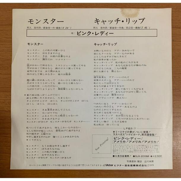 1978年にリリースされたピンク・レディーの大ヒットシングル「モンスター」。