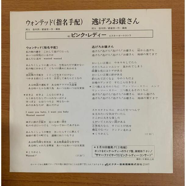 1977年にリリースされた、ピンク・レディーの大ヒットシングル「ウォンテッド(指名手配)」です。