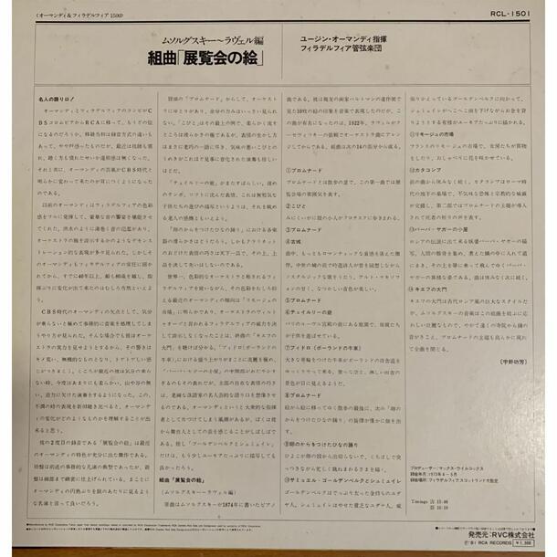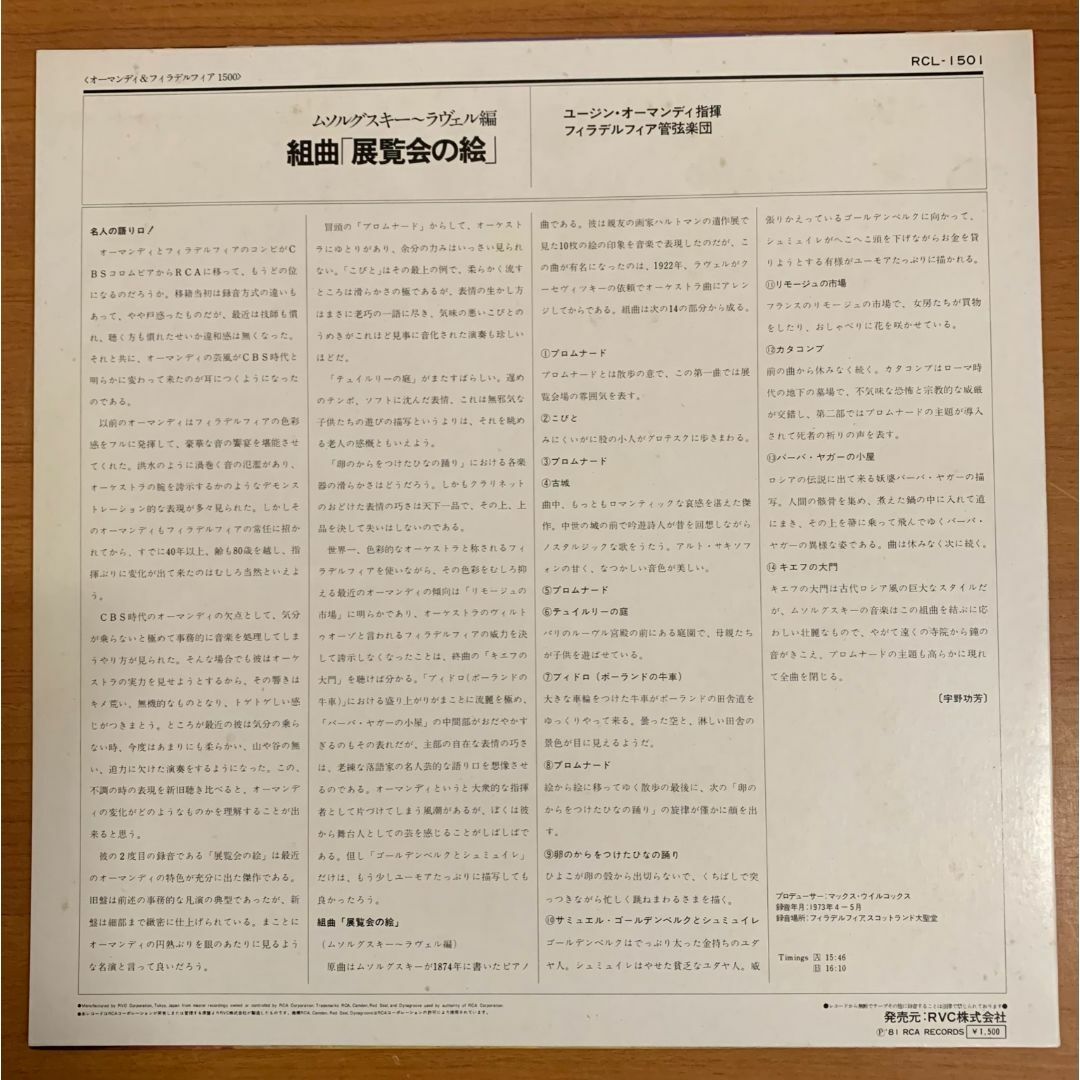 ムソルグスキーの代表作「展覧会の絵」をラヴェルがオーケストラ用に編曲した名曲を、20世紀を代表する名指揮者ユージン・オーマンディがフィラデルフィア管弦楽団と共に録音した一枚。