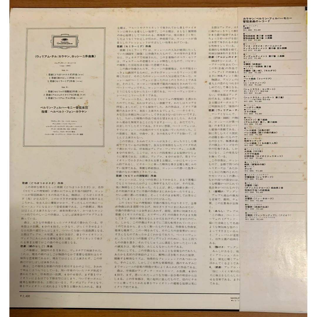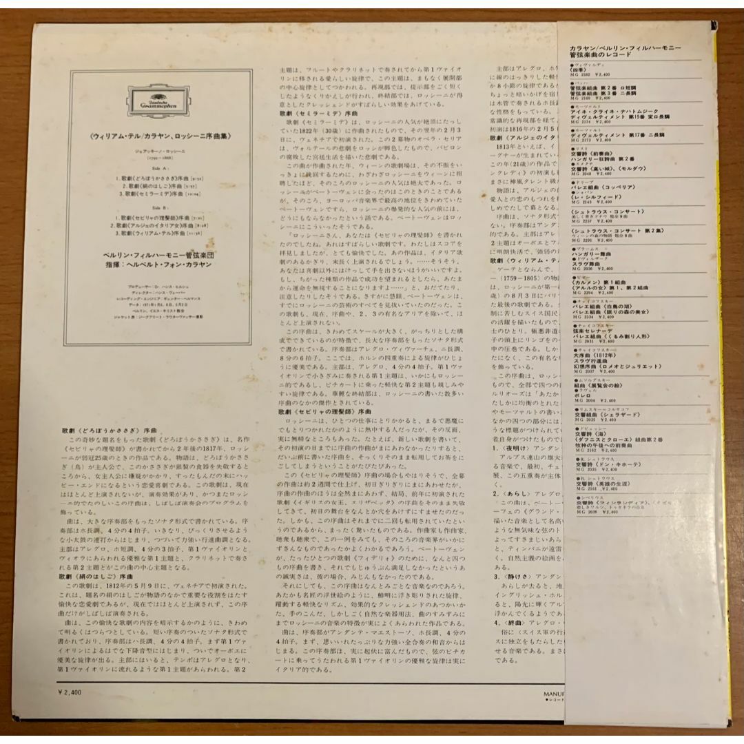 世界的巨匠 ヘルベルト・フォン・カラヤン がベルリン・フィルハーモニー管弦楽団を指揮した、ロッシーニ序曲集の名盤LPです。