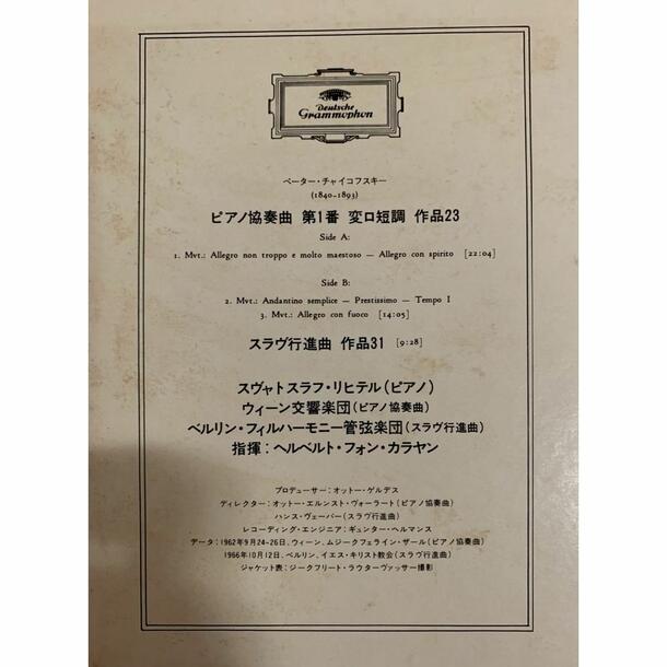 ロシアの名ピアニスト スヴャトスラフ・リヒテル と、20世紀を代表する巨匠指揮者 ヘルベルト・フォン・カラヤン、そして ベルリン・フィルハーモニー管弦楽団 による、チャイコフスキー「ピアノ協奏曲第1番」の名演を収録したLPレコードです。