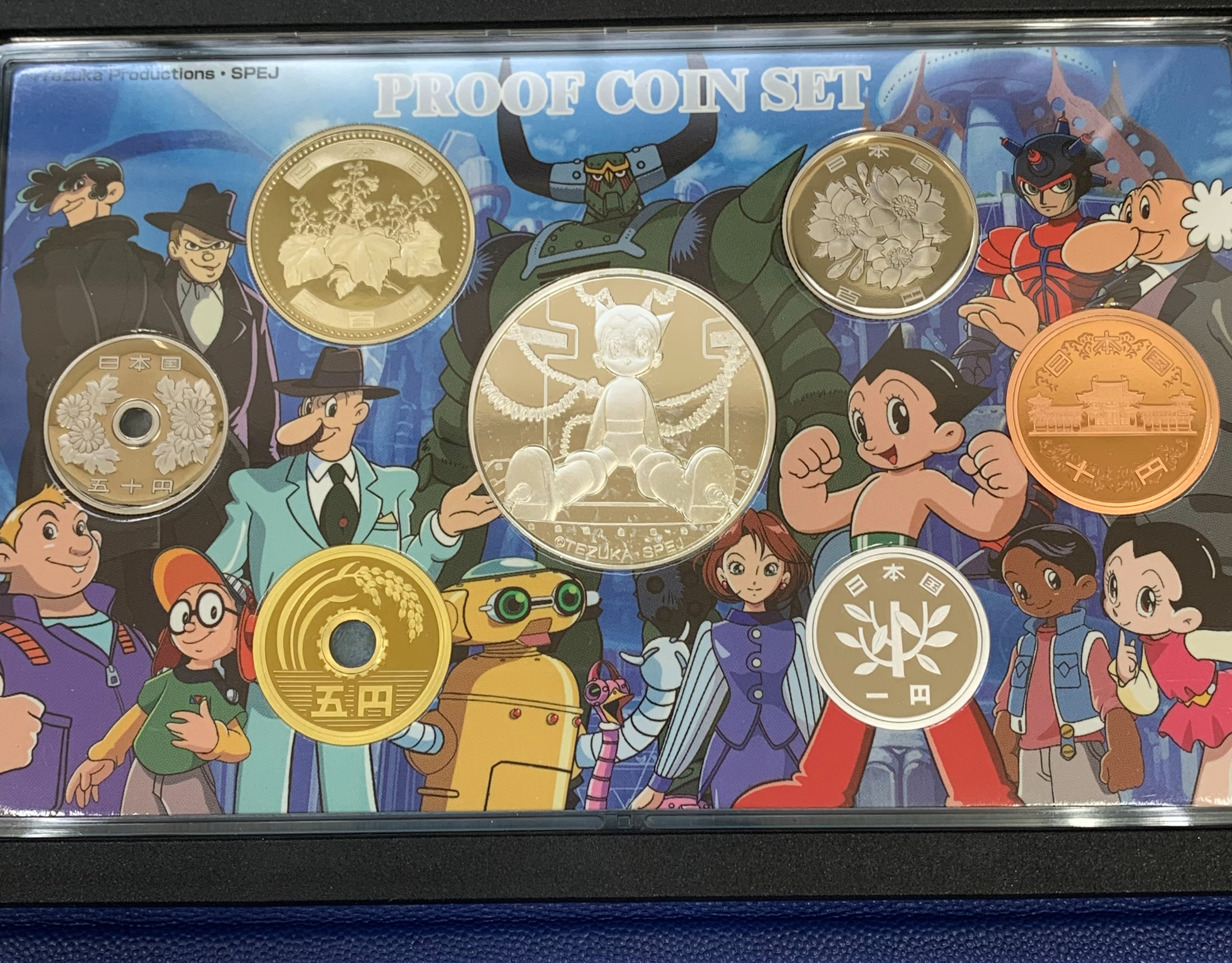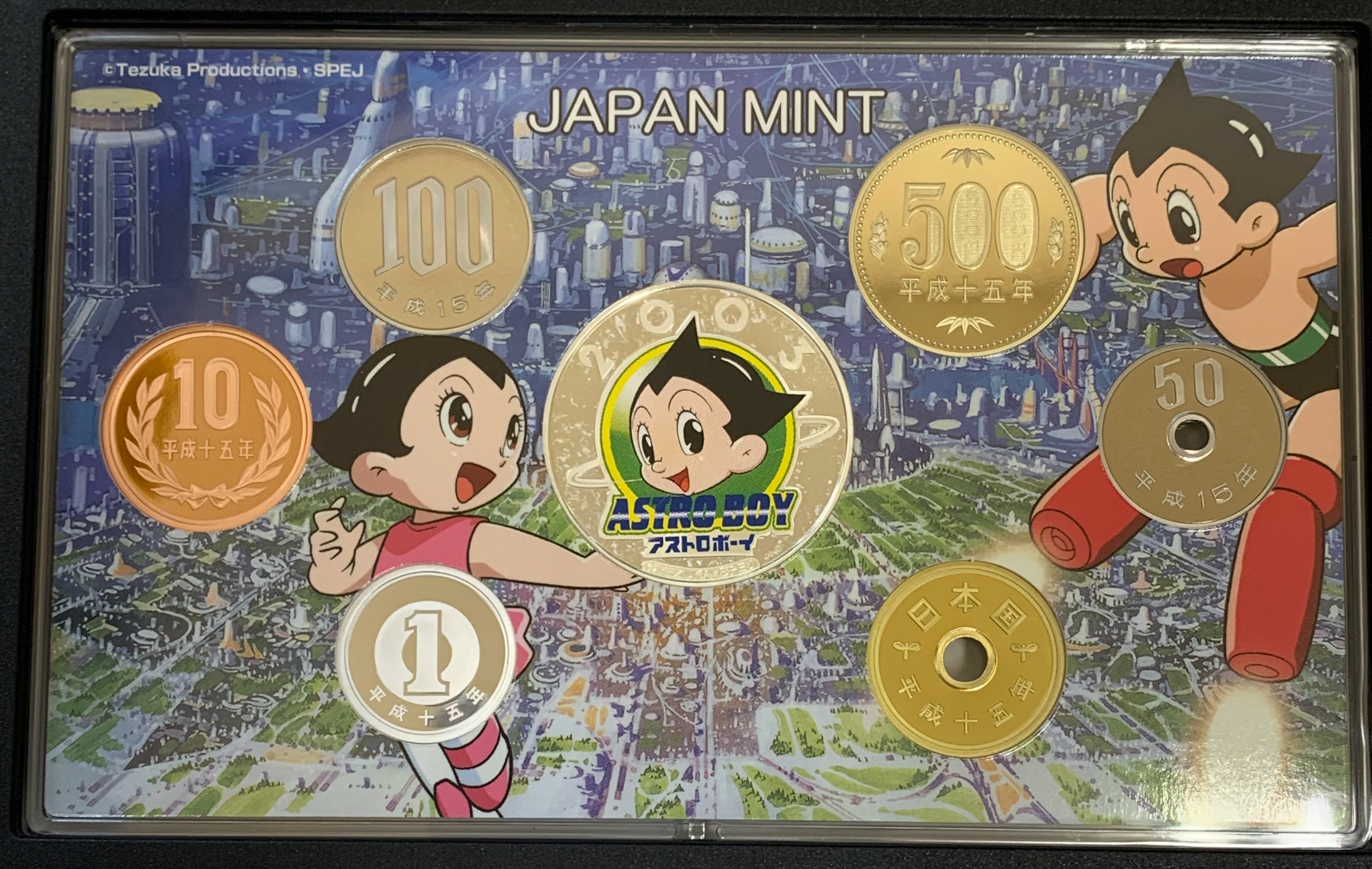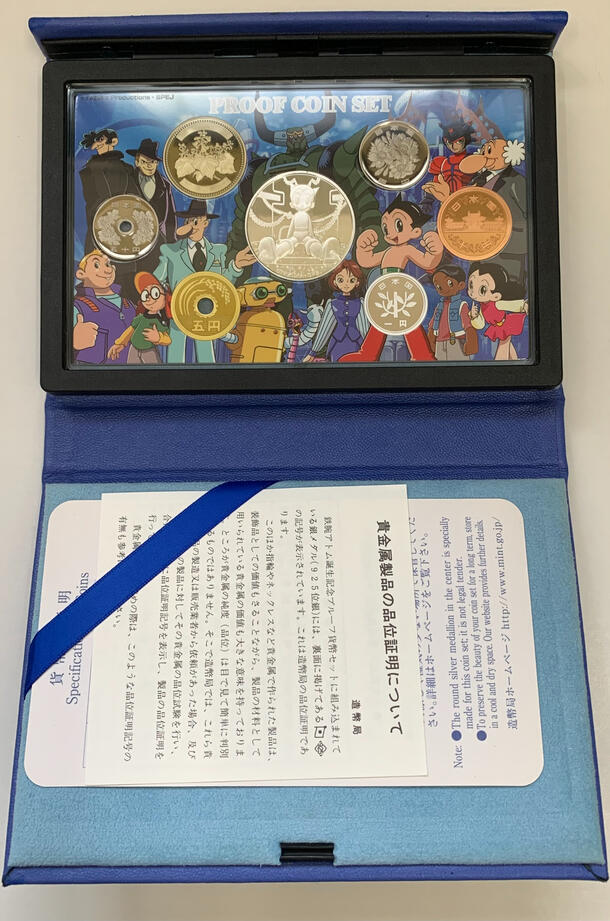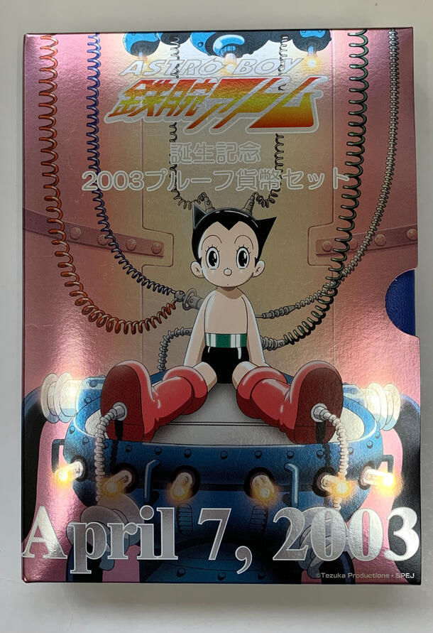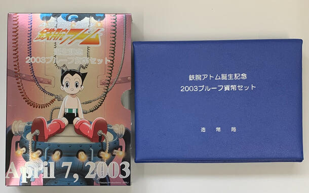 「アトム誕生日」とされる2003年4月7日の年にちなんで作られた記念仕様で、アニメファン・コイン収集家の双方から人気の高いセットです。