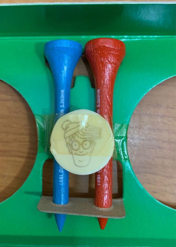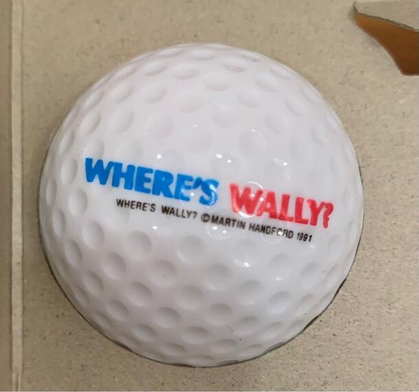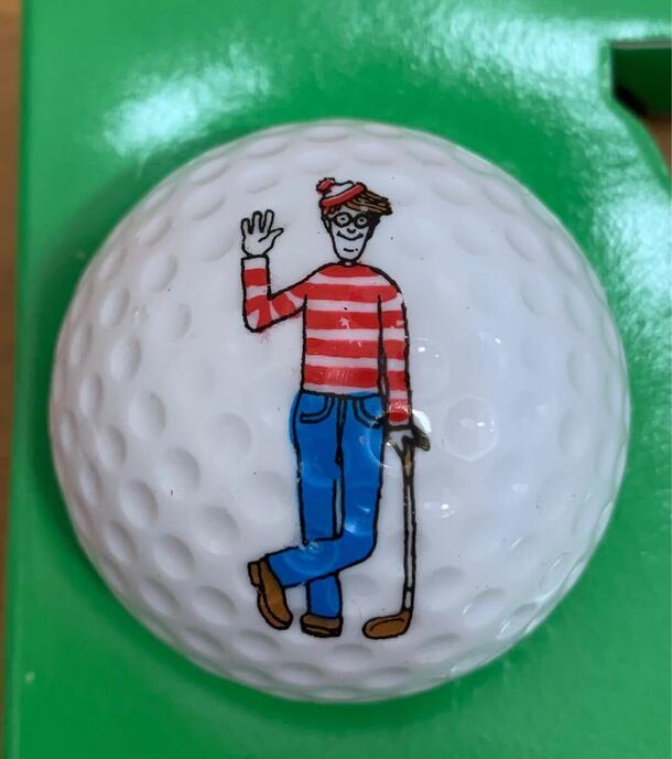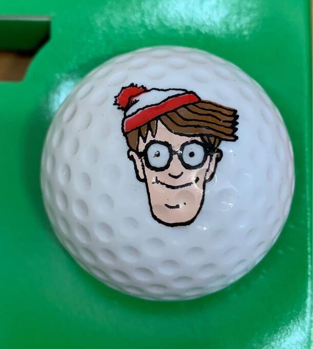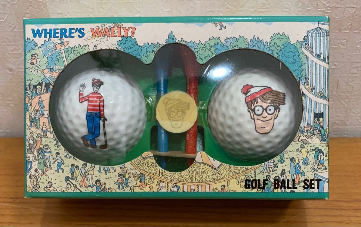 赤と白のボーダーに丸メガネでおなじみのウォーリーが描かれたゴルフボール2個と、