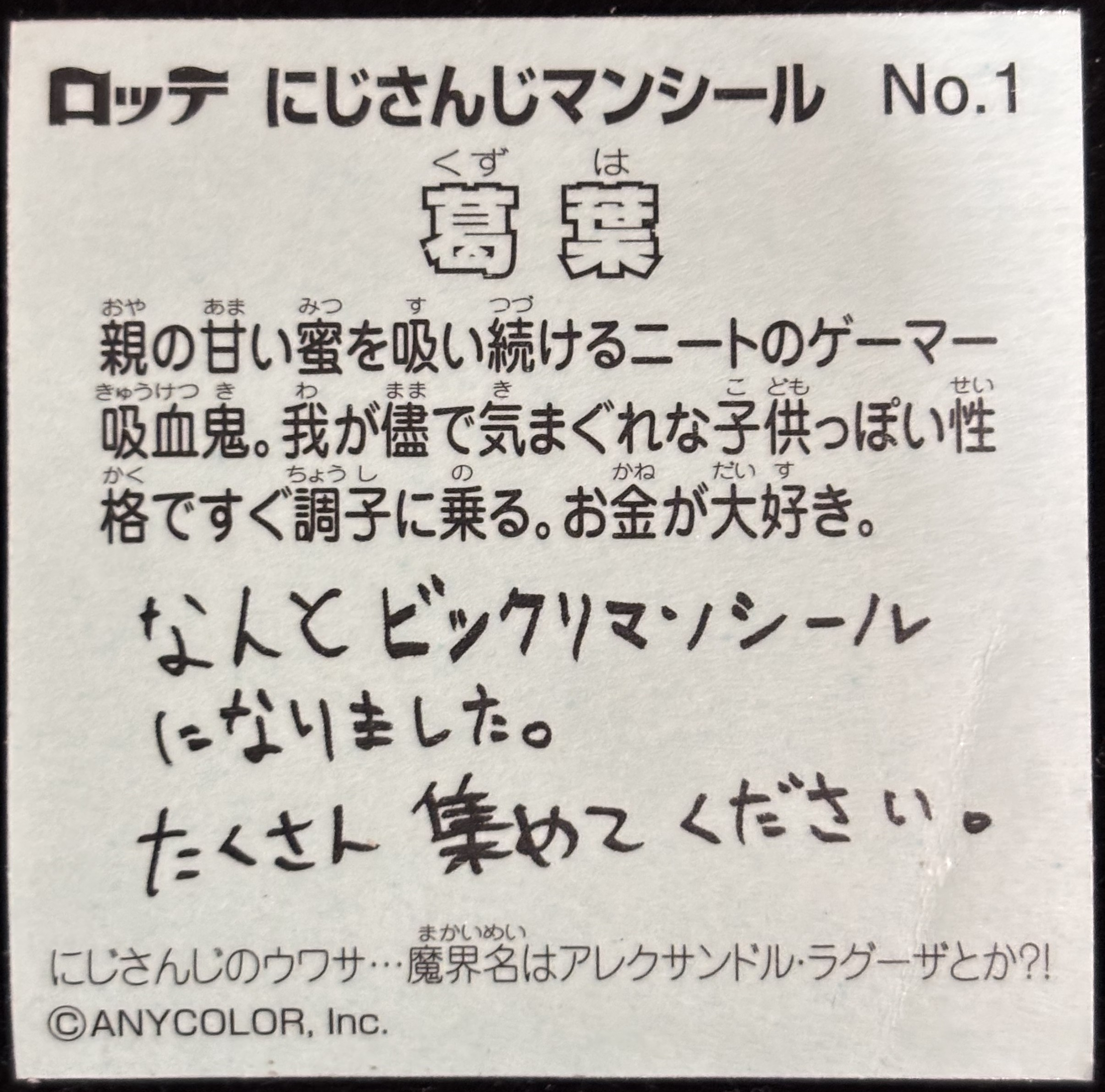 にじさんじマンチョコより、ノーマルカード 「葛葉(くずは)」No.1です。