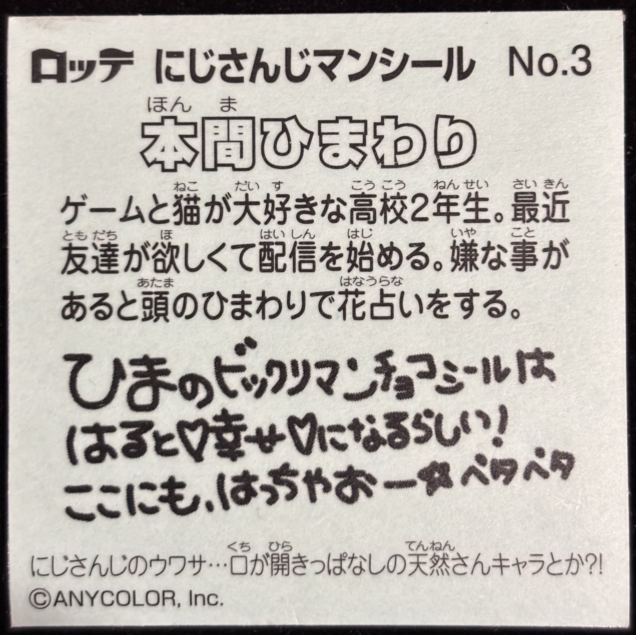 にじさんじマンチョコより、ノーマルカード 「本間(ほんま)ひまわり」No.3です。