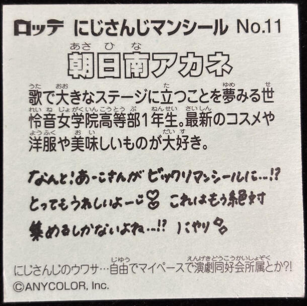 にじさんじマンチョコより、ノーマルカード 「朝日南(あさひな)アカネ」No.11です。