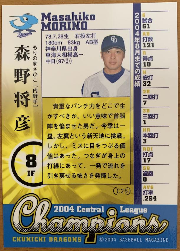 2004年のセントラル・リーグを制覇した『オレ竜』・中日ドラゴンズの優勝記念カードセットのレギュラーカードより、森野将彦選手です。この『オレ竜』セットは6000ボックス限定発売ですので、各シングルカード6000枚限定ということになります。