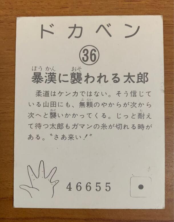 昭和の人気野球漫画『ドカベン』(原作:水島新司)のミニカード、36番「暴漢に襲われる太郎」です。